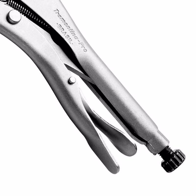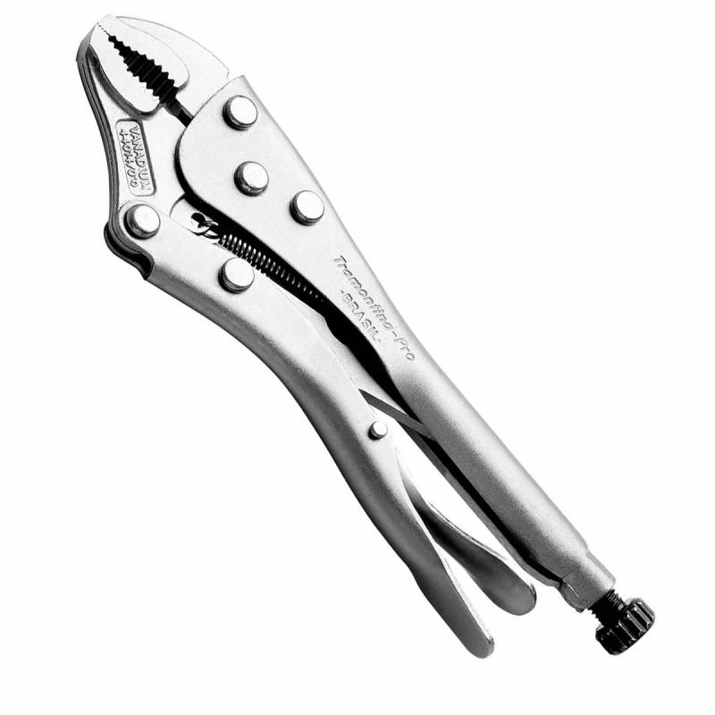 Alicate de Pressão 10 POL Mordente Curvo 44014110 TRAMONTINAAlicate de Pressão Mordente Curvo 10″ Tramontina PROPrende, trava e não solta! Esta é a principal característica do alicate de pressão da Tramontina PRO que auxilia na fixação de peças que serão cortadas, lixadas ou soldadas, por exemplo.A ferramenta certa para você que precisa de resistência e segurança.DADOS GERAIS:Mordentes forjados em aço cromo vanádio.Corpo formado por chapas conformadas.Acabamento cromado.Abertura regulável.Possui alavanca para destravar.Possui mordentes com perfil curvo.Os alicates de corte são testados quanto à resistência ao desgaste do gume de corte em máquina de ensaio específica.Os alicates possuem dureza diferenciada no gume de corte e no corpo.Segurar, puxar e prender peças firmemente.Em trabalhos leves pode ser usado como uma prensa.As ferramentas são produzidas e testadas conforme normas específicas.MEDIDAS:A: 65.0 mmB: 232.0 mmC: 55.0 mmD: 19.0 mmE: 12.0 mmPeso: 0,56 kgGarantia: Garantia total contra vícios ou defeitos de fabricação.Código de Fábrica: 44014110Marca: Tramontina Pro* Imagens meramente ilustrativas.
