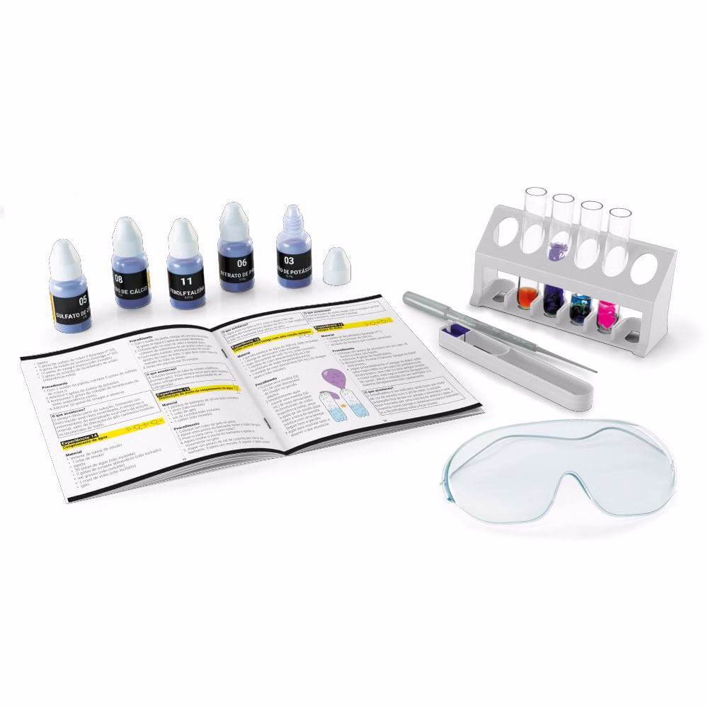 Componentes 4 tubos de ensaio de vidro, 1 estante plástica, 1 pinça plástica, 1 pipeta, 1 vareta e um pequeno tecido para limpeza dos tubos de ensaio, 1 unidade de óculos de proteção e 05 bisnagas com substâncias e 1 manual de instruções colorido.