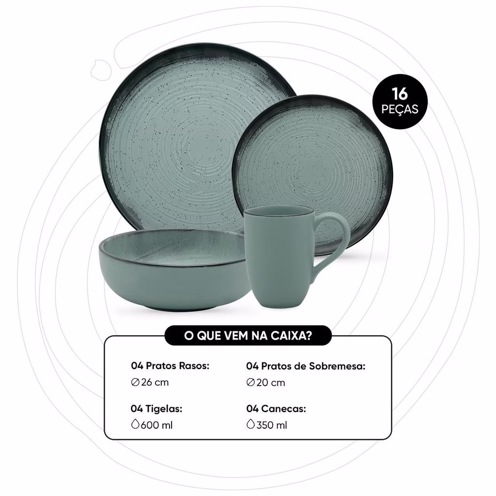 Conteúdo da embalagem: 4 Pratos Rasos 26Cm, 4 Pratos Sobremesa 20Cm, 4 Tigelas Flat 600ML, 4 Canecas Flat 350Ml