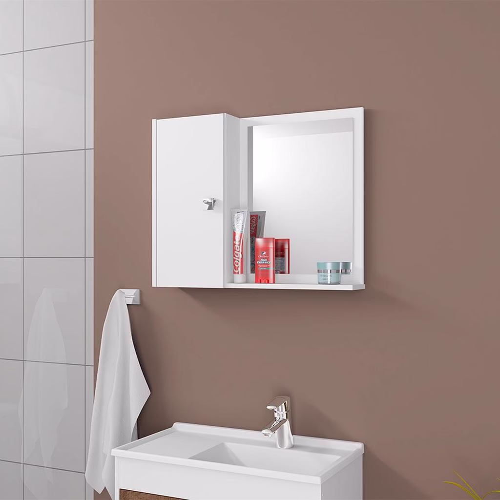 Extremamente funcional, ela possui uma porta com uma prateleira interna criando 2 nichos com amplo espaço interno, neles você poderá guardar todos os produtos de higiene pessoal que deseja, perfumes, dentre muito outros artigos de beleza que deseje armazenar na espelheira.