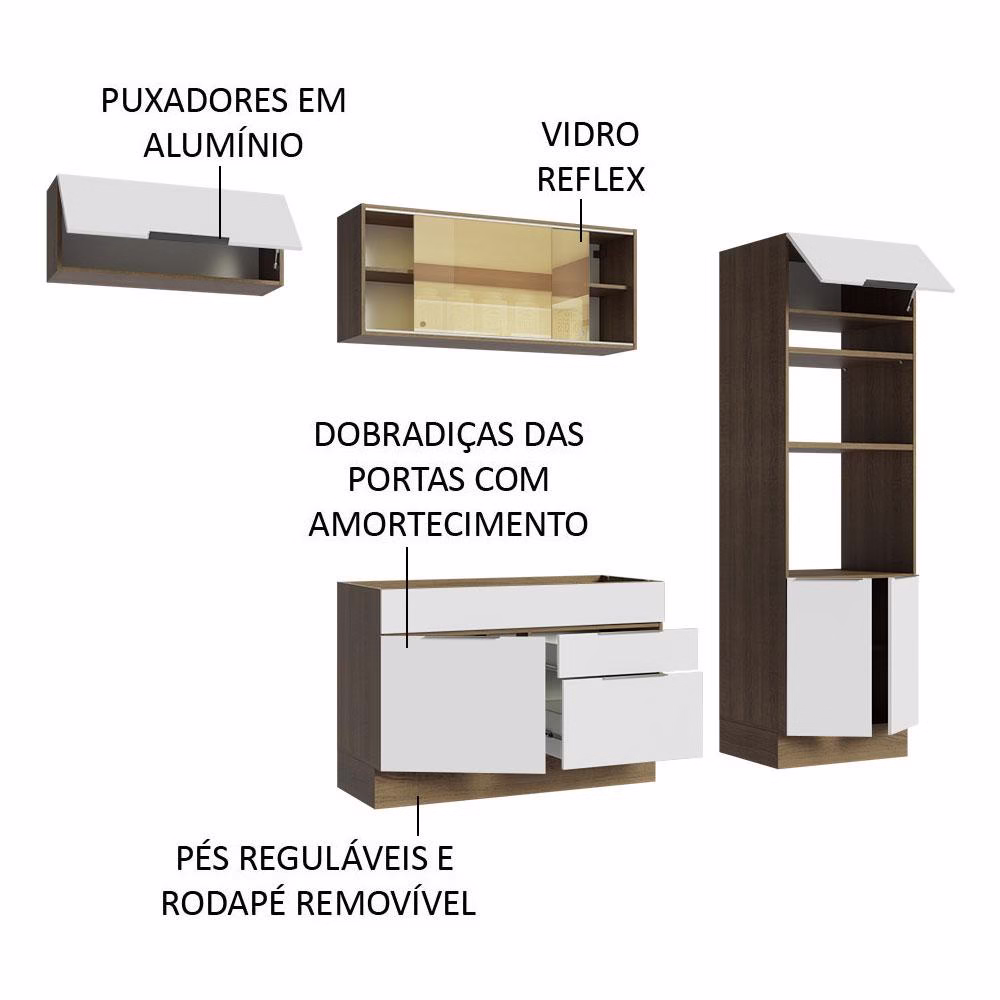 O móvel conta com puxadores em alumínio no modelo slim, gavetas com corrediças telescópicas e portas com amortecimento para fechamento suave. Além disso, os pés são reguláveis em PVC, com rodapé removível de MDP.