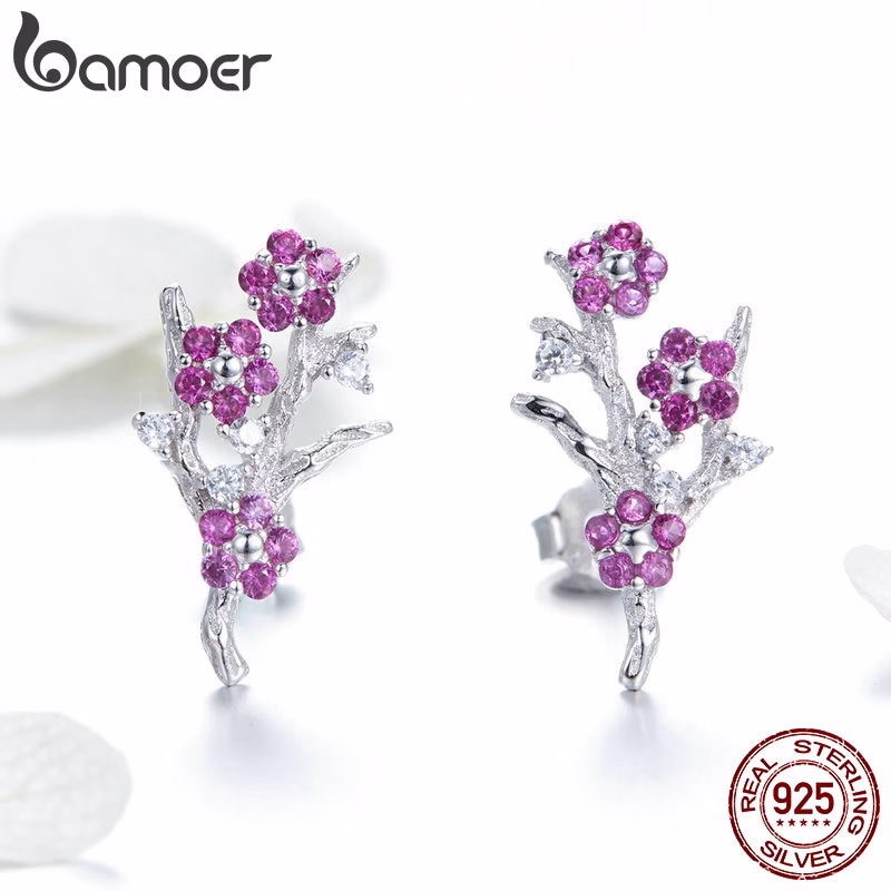 Bamoer Brincos De Tarraxa De Prata Esterlina 925 Blooming Ameixa Bse040