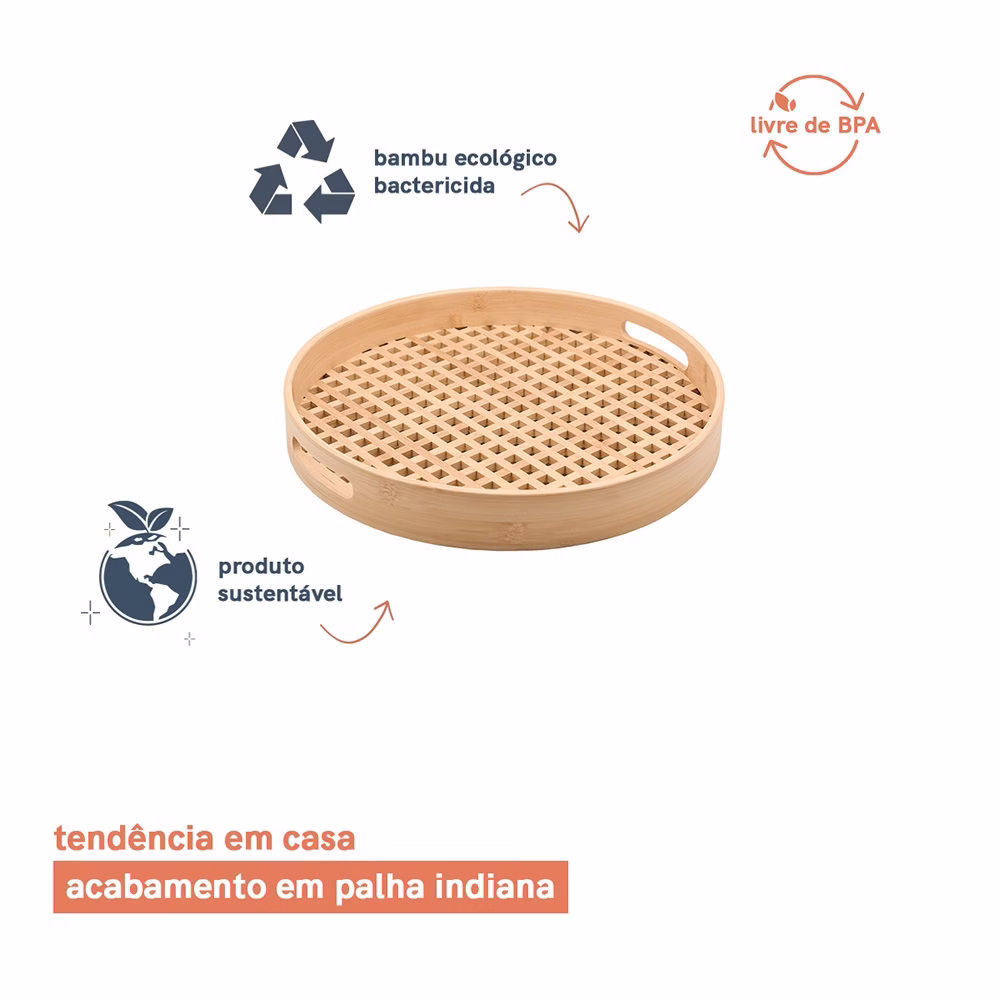 Multiuso, durável, higiênica e decorativa, pode ser usada tanto para servir comes e bebes, para organizar objetos como perfumes e copos ou para exibir itens de decoração na casa. É versátil! Combina com diversos ambientes, da cozinha ao quarto, da sala ao banheiro e possui design moderno, o tom natural do bambu e a textura de palha deixam os cômodos mais rústicos e cheios de bossa.