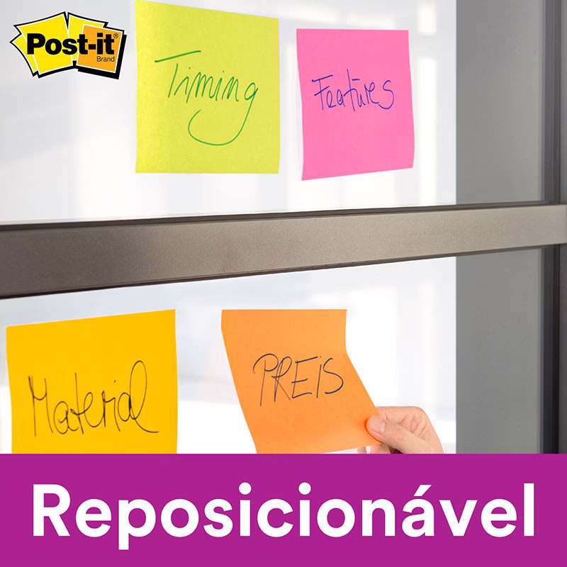 O Bloco Adesivo Amarelo Post-it® foi inventado por um pesquisador da 3M em 1980 e, desde então, conquistou o mundo! A inovação não parou por aí e outros tamanhos, formatos e cores vieram para facilitar ainda mais o nosso dia a dia. O Refil do bloco adesivo Post-it® da 3M, é especialmente produzido para ser utilizado nos Suportes Post-it® e tem um formato que lembra uma “sanfona”. Esse formato especial permite que ao puxar uma folha adesiva, você sempre tenha outra sempre à mão, retirando uma folha por vez de forma fácil e prática. Suas folhas são reposicionáveis, ou seja, possuem adesivo de qualidade 3M, que permite que sejam retirados e recolocados, sem danificar papéis ou outras superfícies, sem deixar resíduos do adesivo e sem perder a eficiência na fixação. Traga mais cor ao seu dia a dia e personalize sua mesa de trabalho ou anotações com blocos adesivos na cor verde neon. Você anota todos os seus compromissos e lembretes, classificando-os por cor. São 90 folhas adesivas por bloco. Possui 2x mais adesão do que o bloco original Post-it® amarelo. Post-it® é perfeito para levar para qualquer lugar e chamar a atenção para as atividades na área de trabalho, na escola ou em casa.