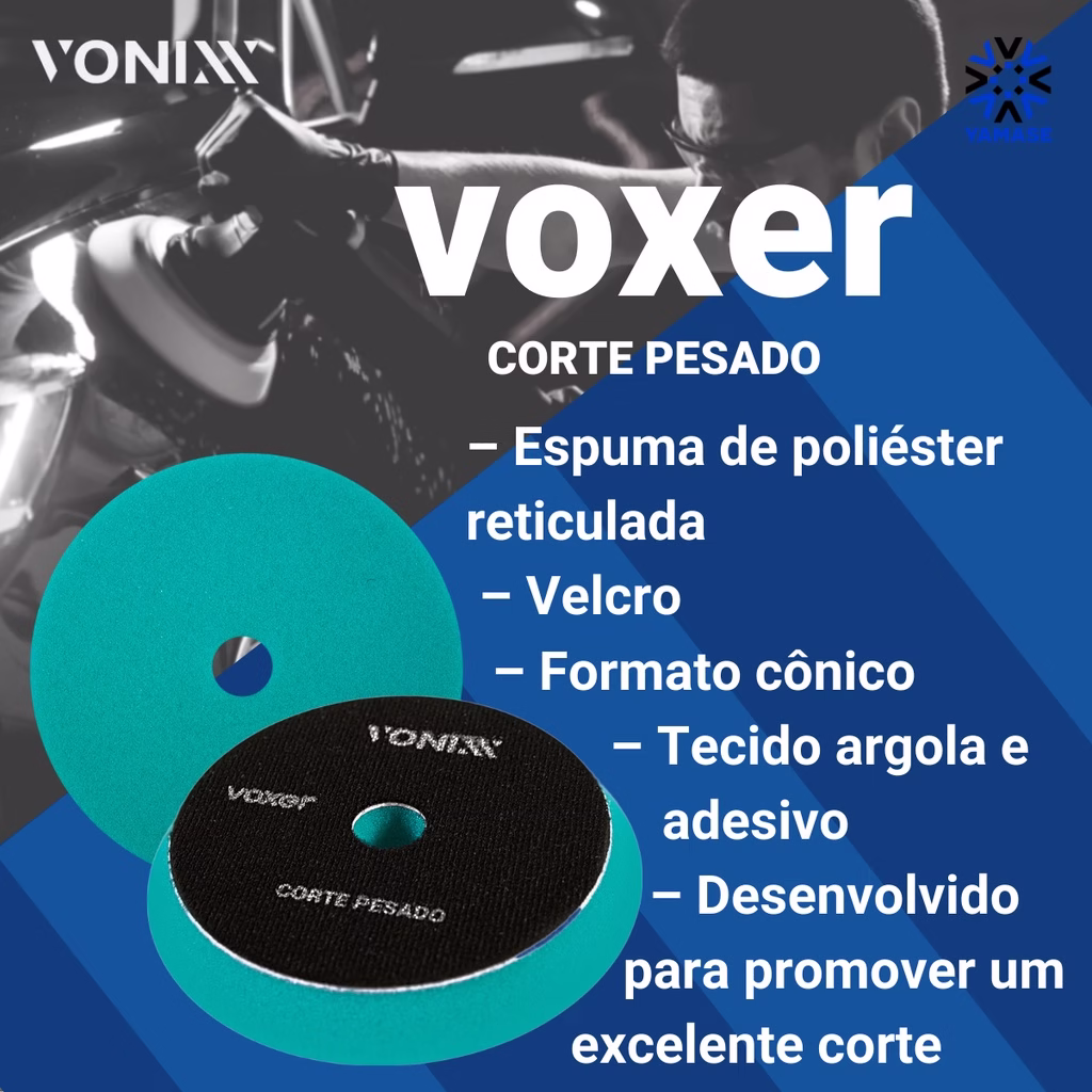 Boina Voxer Corte Pesado foi desenvolvida para promover um excelente poder de corte com alto nível. Sua espuma possui maior abrasividade e remove facilmente os riscos severos, promovendo um excelente acabamento na superfície. Pode ser utilizada em máquina de roto-orbital ou rotativa.