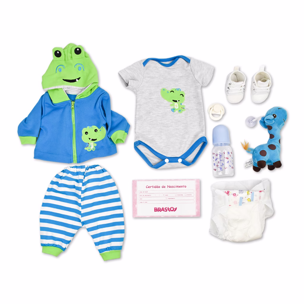 Lista de pacotes:1X Boneca Reborn,1X Mamadeira,1X Chupeta Imã,1X Par de Calçado,1X Girafa de Pelúcia,1X Fralda,1X Certidão de Nascimento,1X Conjunto de roupas (idêntica as fotos)