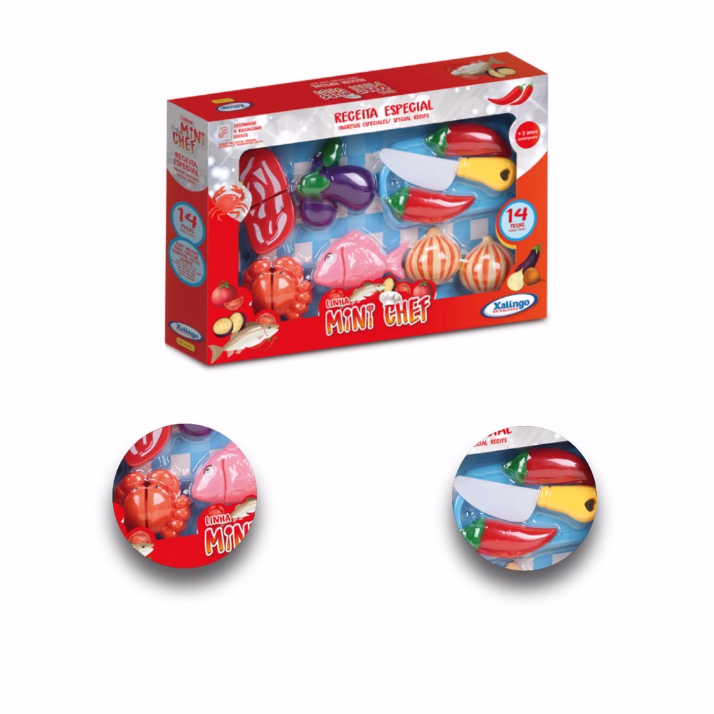 O Kit de brinquedo contém 6 diferentes legumes e carnes para “cortar”, uma “ faquinha” e uma “tábua” para o corte para tornar o faz de conta mais real.