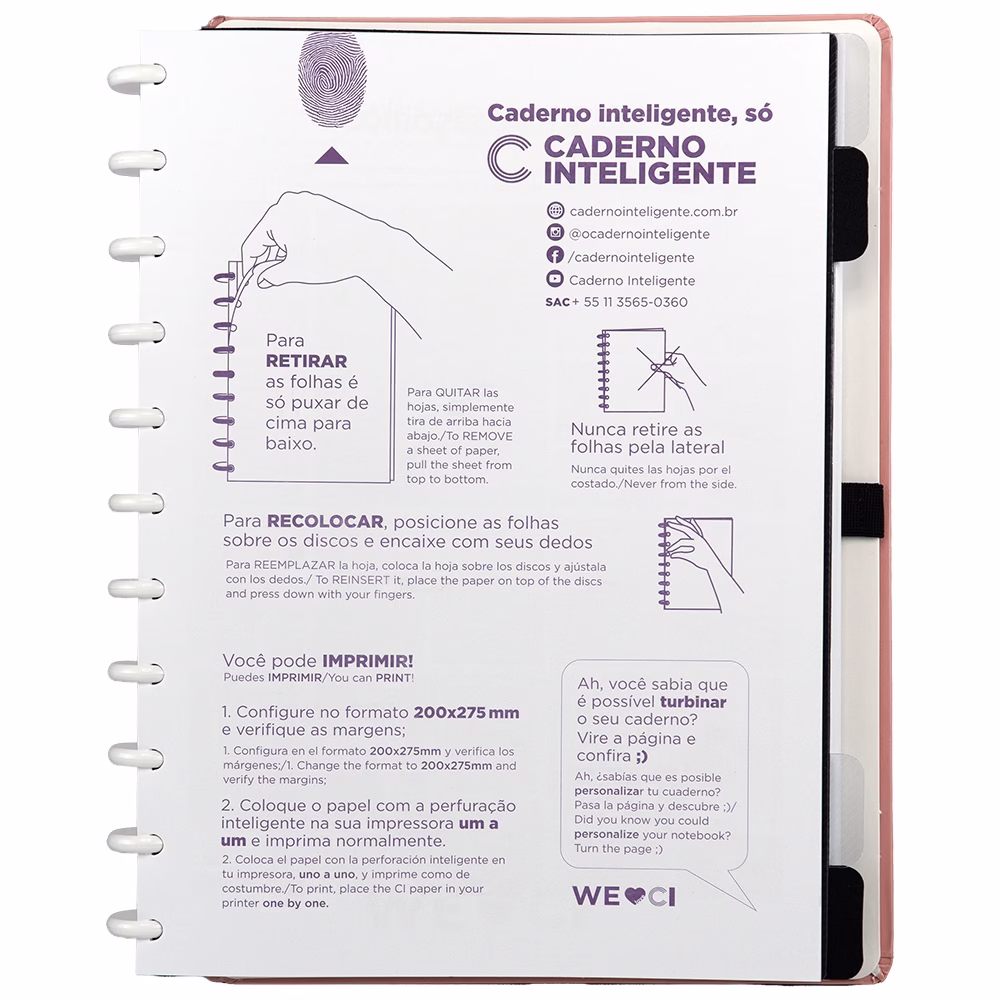 Caderno Inteligente com 01 folha de identificação, 01 calendário, 01 elástico para 01 caneta ou 01 lápis, 04 divisórias com abas (02 pretas e 02 transparentes) e01 bolsa plástica transparente.