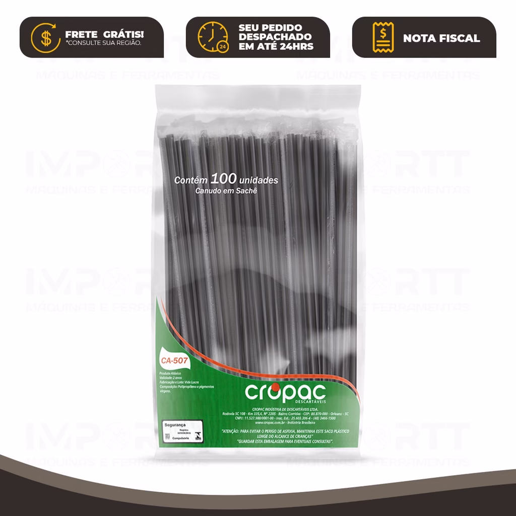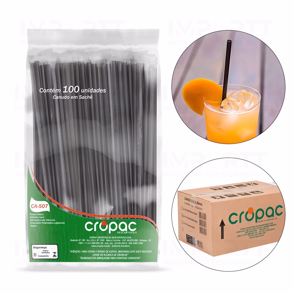 Canudo com sachê (embalado individualmente), garante a higiene da fabricação ao momento do uso.