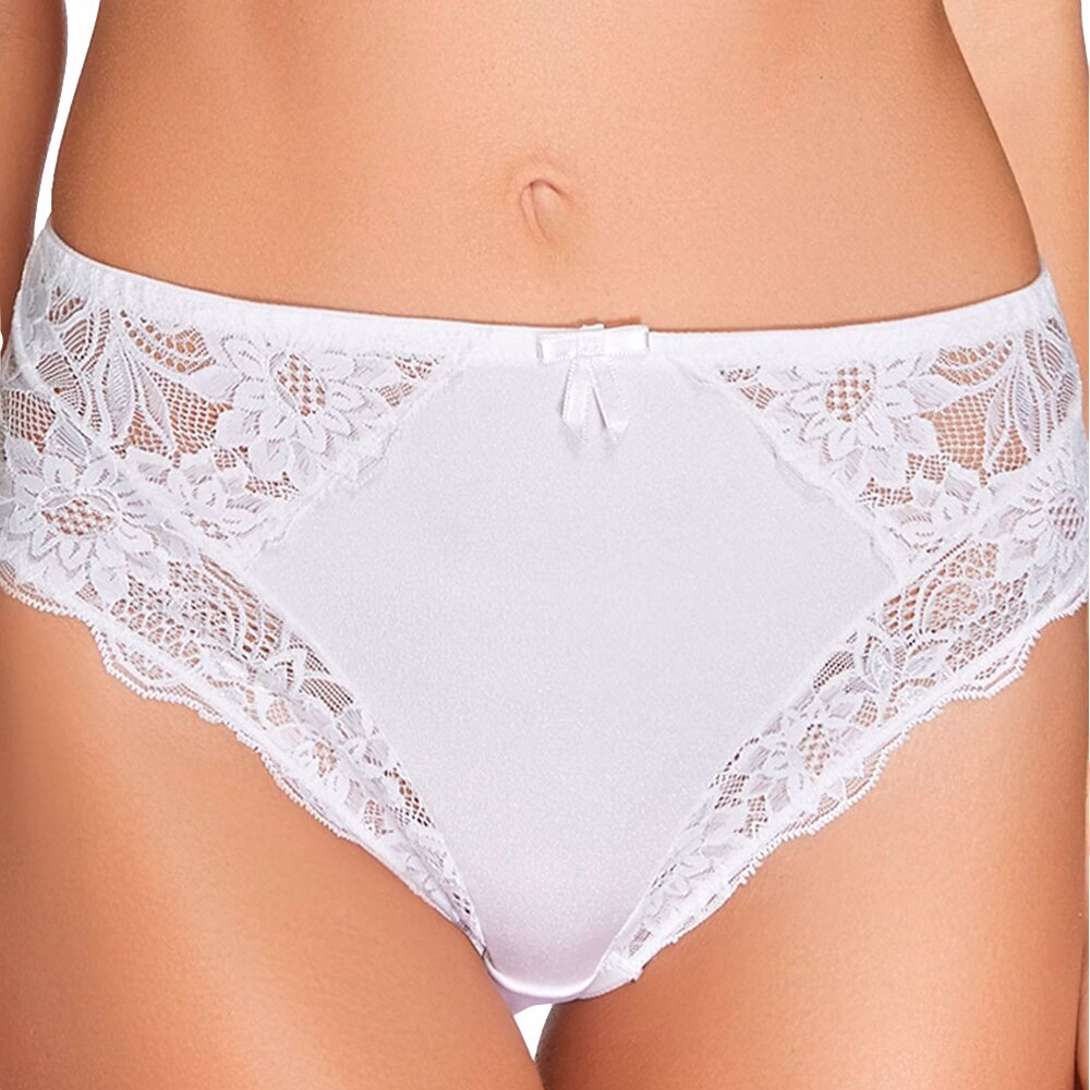Calcinha cavada com cós alto e recorte em renda na parte da frente
