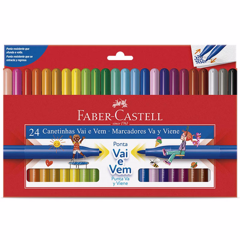 As canetinhas hidrográficas Faber-Castell estimulam a criatividade das crianças com a formulação exclusiva de corantes de alta qualidade com cores mais vivas. As canetinhas tem ponta média com a tecnologia exclusiva da ponta Vai e Vem: sistema de amortecimento contra impactos, garantindo maior resistência e durabilidade. A tinta é lavável e o produto é atóxico.