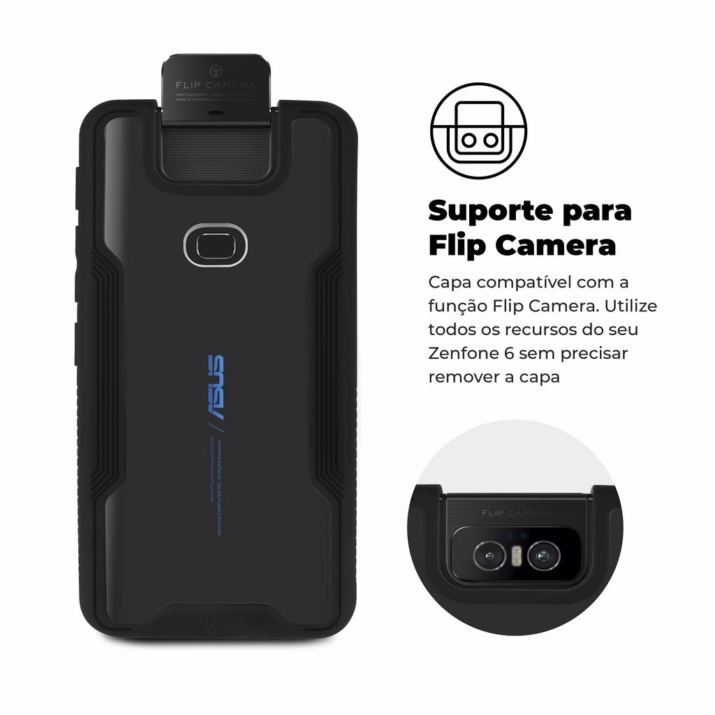 A Capa Dual Shock para Zenfone 6, da Gshield, foi projetada com uma dupla proteção. Além da proteção padrão de capas, a Dual Shock possui uma elevação na parte traseira que evita que a câmera entre em contato direto com os impactos