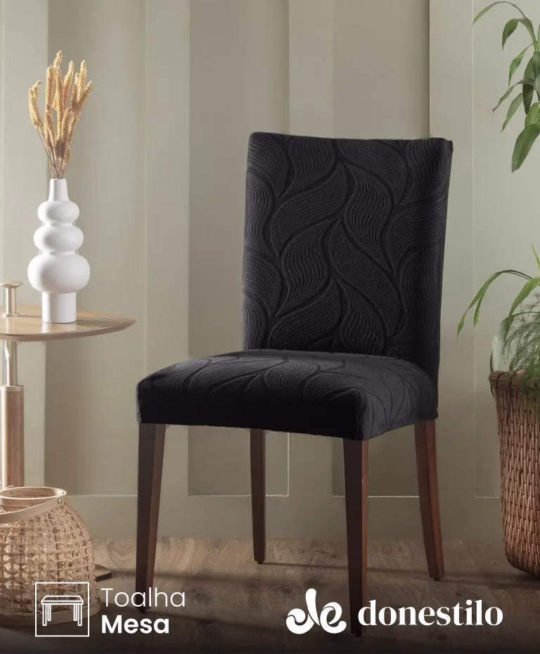 Capa de Cadeira Veludo Folhagem 40×60 cm Jolitex une elegância e praticidade. Feita em 95% poliéster e 5% elastano, é macia, ajustável e sofisticada.