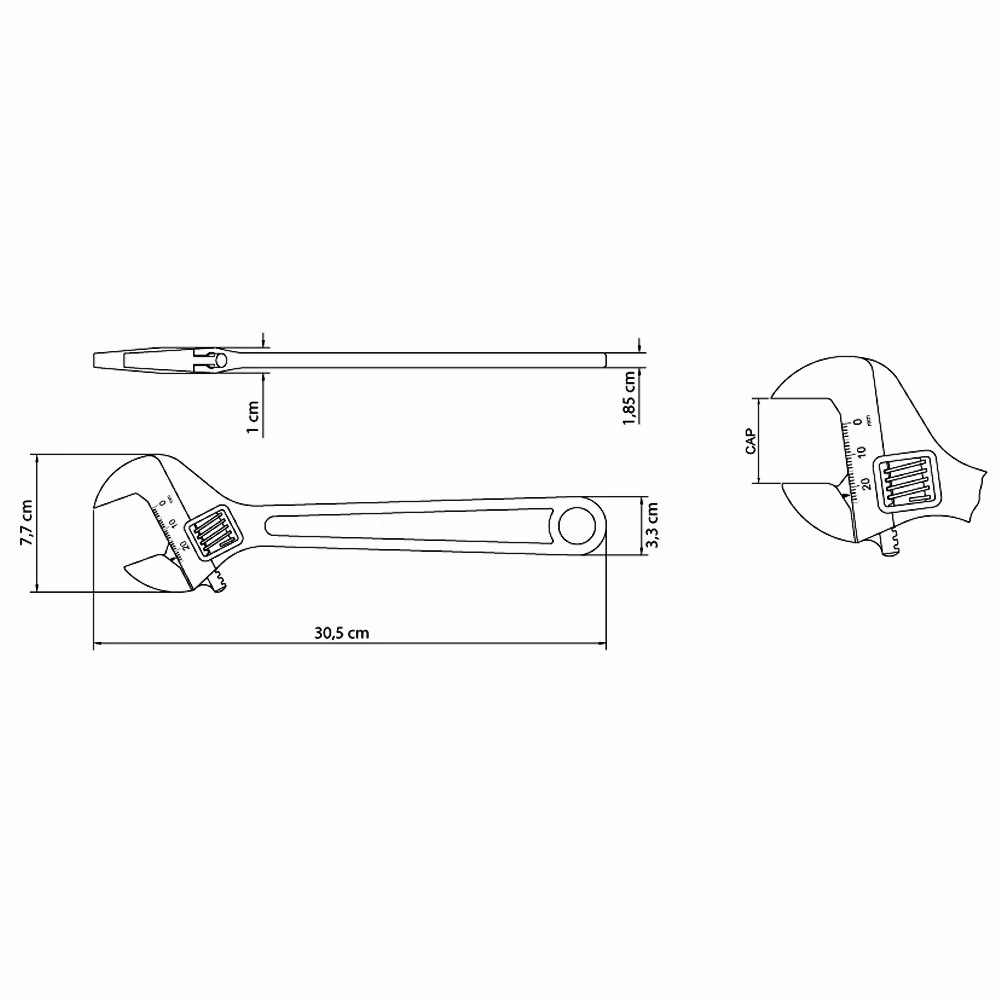 – A escala em milímetros, marcada a laser, no mordente do produto facilita o ajuste do tamanho do parafuso;