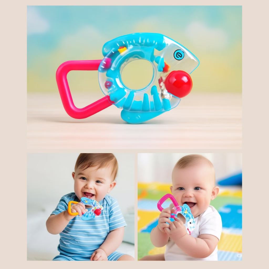 Chocalho E Mordedor Peixinho VMPCom esse chocalho seu bebe ira se distrair e se divertir.E o mordedor ideal para auxiliar o bebe na fase de dentição.O som produzido ao agitar o chocalho estimula a audição da criança.Texturas tridimensionais que desenvolvem o reconhecimento tátil.As cores vibrantes são estímulos visuais para o bebe.