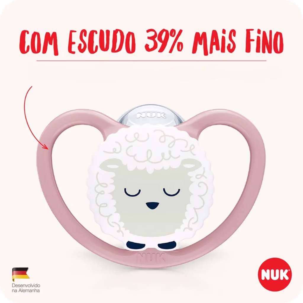 A Chupeta NUK Space Glow brilha no escuro e pode ser encontrada rapidamente, sem precisar acender a luz durante a noite Sua tecnologia “brilha no escuro” não é tóxica e não faz mal a saúde da criança A NUK Space foi desenvolvida com canais extragrandes de ventilação para permitir a máxima circulação de ar, possibilitando que a pele sensível respire.