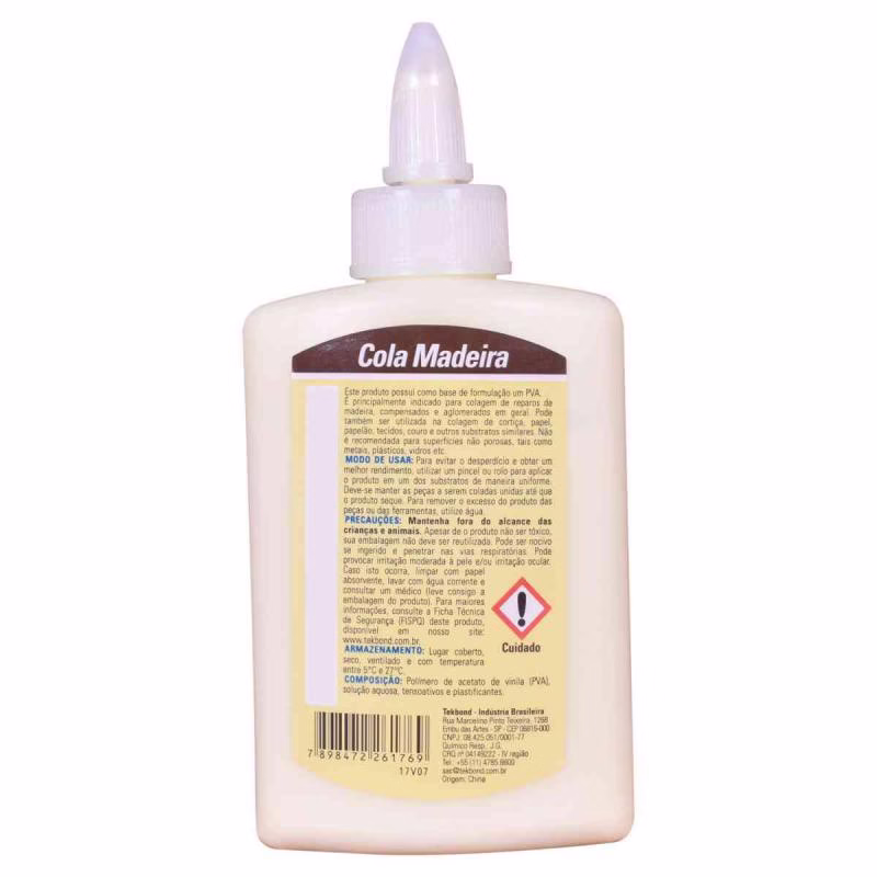 Cola de Madeira 100 GR TEKBONDÉ ideal para colagens e reparos de móveis, encaixes, tacos, montagem de conjuntos de madeira e aplicações de laminação a frio.Excelente adesão a materiais porosos, tais como concreto, tecido, couro, têxteis, madeira, papelão e feltro.Características:É uma emulsão de copolímero de acetato polivinílico especial que adere a diversos tipos de substratos e materiais porosos.Instruções de uso:Aplicar uma camada uniforme do adesivo em uma das superfícies, em seguida faça a união das peças antes da secagem do adesivo e prense.A cura total é de 24 a 48 horas em função do clima, quantidade de adesivo e peso das peças a serem fixadas.Dados Técnicos:Aparência (visual): Líquido levemente amarelado com odor característicoViscosidade a 25°C: 30.000 a 60.000Teor de sólidos: 39 a 41 %pH a 25°C: 6,00 a 8,00Densidade a 25°C: 1,03 a 1,05Temperatura de aplicação: + 5 a 45°CTemperatura de serviço: – 30 a 90°CCódigo: 22911007000Marca: TEKBONDEmbalagem: 100 grGarantia: 06 meses* Imagens meramente ilustrativas.