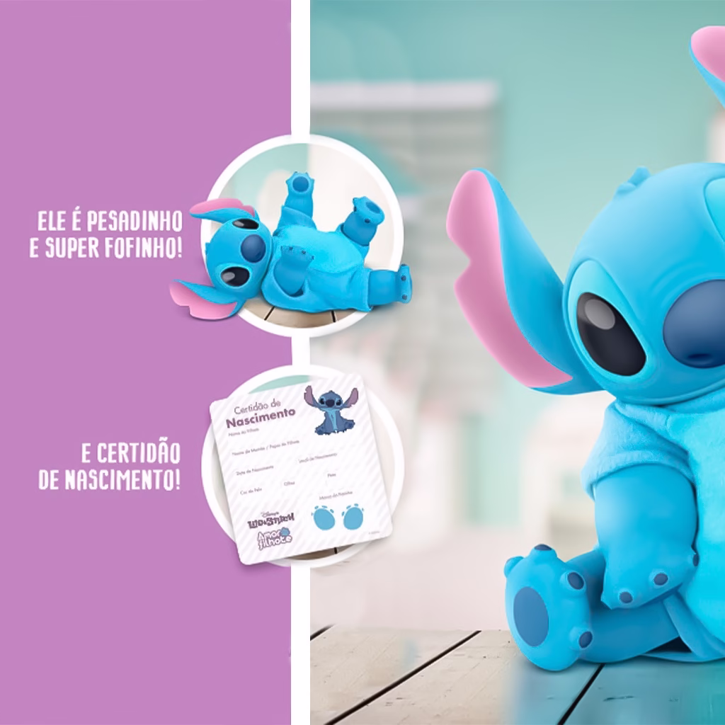 Uma surpresa de outro mundo chegando para você e todo o Brasil! O carismático Stitch ganha sua versão Amor de Filhote, uma linha de personagens Disney que é sucesso de vendas. Bonecos feitos em vinil especial, atóxico, com toque suave e corpo macio para apertar. Vem com Certidão de Nascimento.
