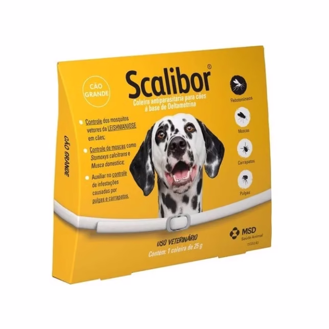 Scalibor® é uma coleira antiparasitária que possui elevada eficácia contra pulgas, carrapatos, moscas e mosquitos, inclusive o transmissor da Leishmaniose, contribuindo para a segurança do seu cão e da sua família.