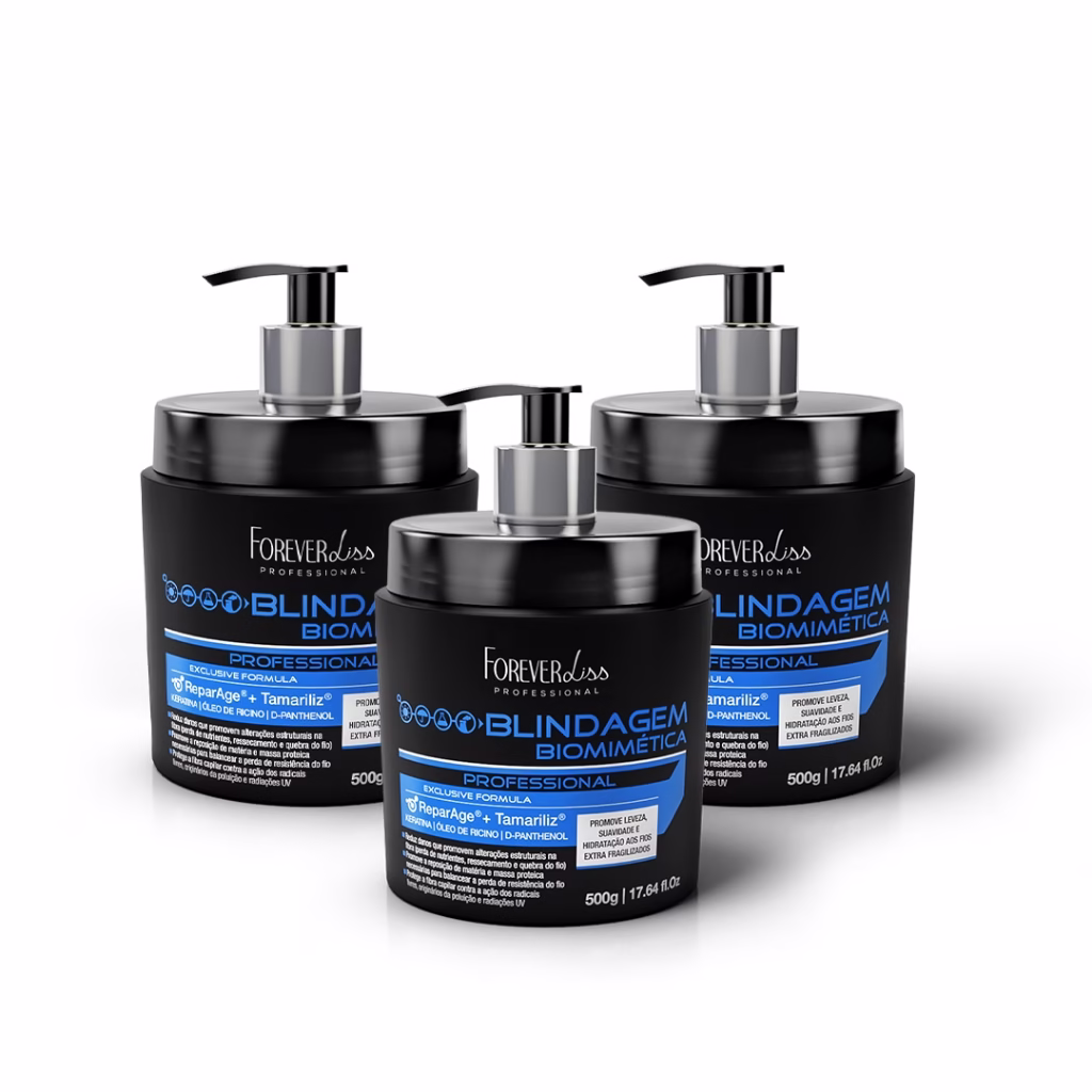 A Blindagem Capilar Biomimética 500g Forever Liss foi desenvolvida para reparar a camada mais interna da fibra capilar dos fios danificados pela química. Com fórmula exclusiva que conta com complexo de Aminoácidos, Tamariliz®, Queratina, Óleo de Rícino e D’Pantenol®, tem ação antioxidante que previne o envelhecimento dos fios, além de ser rica em proteínas e vitaminas que repõe a massa perdida ao longo do tempo. Além disso, cria uma camada de proteção que previne novos danos aos cabelos, facilitando com que você curta o verão sem medo de ser feliz! Tem ação suavizante e disciplinante da cutícula capilar, o que resulta em fios macios, sedosos e com brilho extraordinário. Sua ação é termo ativada.