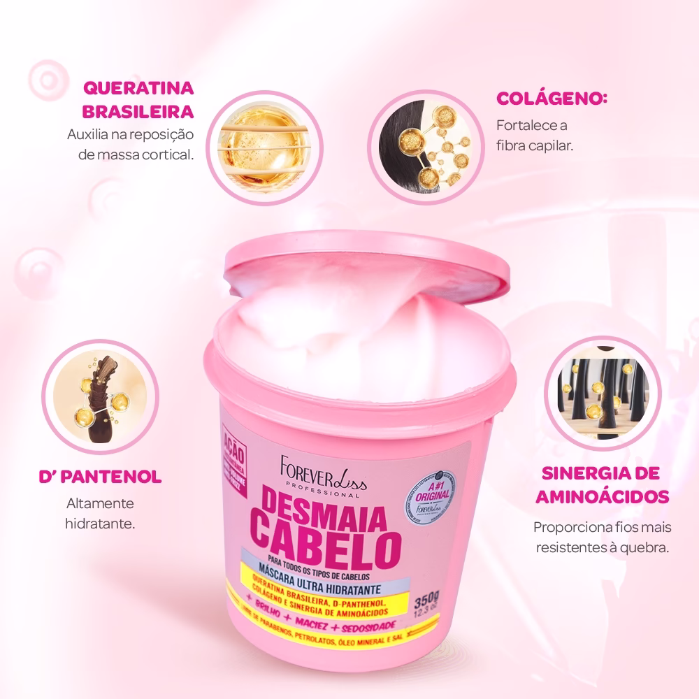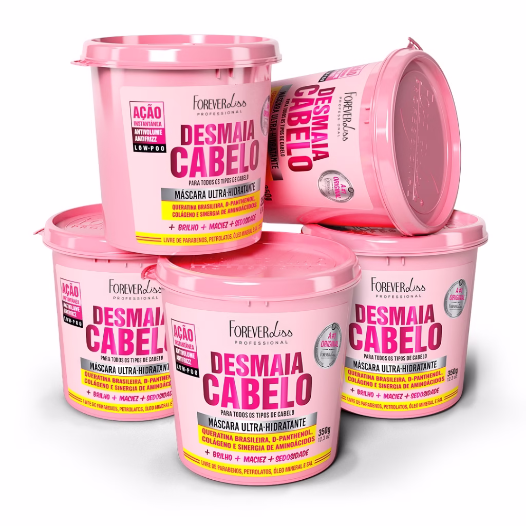 A Máscara Ultra Hidratante Desmaia Cabelo Forever Liss 350g foi desenvolvida para proporcionar aos seus cabelos redução de volume e frizz, ao mesmo tempo em que hidrata também proporciona brilho. Como resultado, seus fios ficarão mais alinhados, brilhantes e com aspecto mais saudável. Além disso, o uso deste produto deixará seus cabelos mais leves e sedosos, o que resulta em um aspecto mais liso. A Máscara Desmaia cabelo Forever Liss se encaixa na etapa de hidro reconstrução no cronograma capilar.