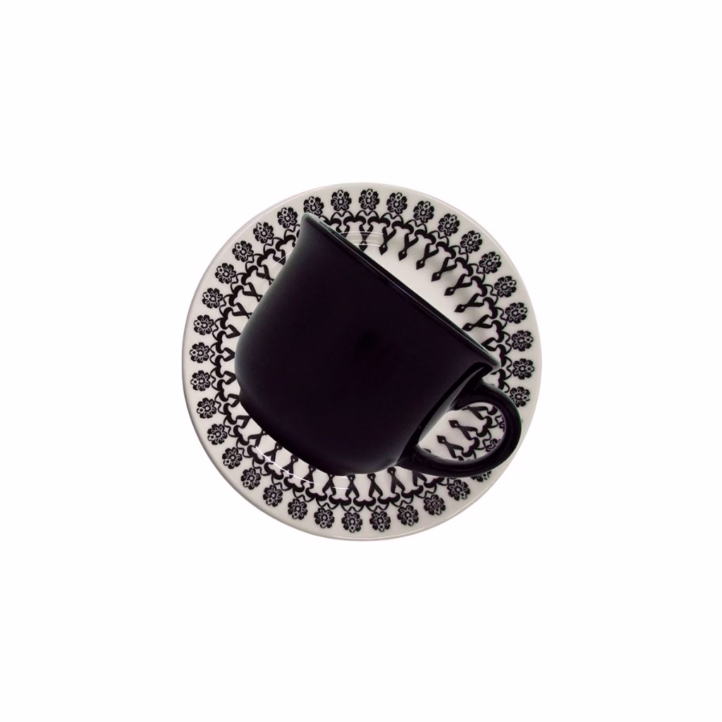 A cor preta é básica e neutra, um verdadeiro curinga na hora de montar a mesa. Nessa louça, colocamos a cor preta numa estampa mais alegre e jovial, perfeita para quem prefere um formato de pratos tradicional com uma decoração mais alegre. A xícara preta, sem decoração, cria uma linda composição com os pires.