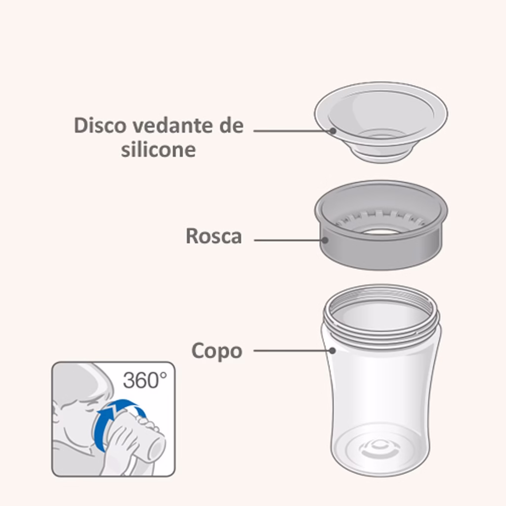 O Copo Evolution 360° (230ml) é ideal para a fase de transição do copo com bebedor para o copo tradicional. O design diferenciado permite que o líquido seja ingerido por toda a sua extensão, sem ser derramado no rosto da criança.