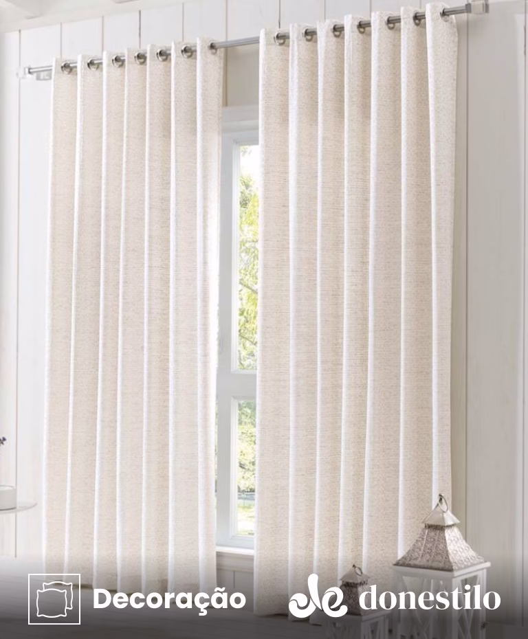Seu tecido translúcido e a tela jacquard de linho misto oferecem um caimento fluido, tornando-a perfeita para salas e quartos. Composta por 63% poliéster, 25% algodão e 12% linho, proporciona resistência, suavidade e um acabamento impecável. Os ilhós cromados garantem uma instalação prática e um visual elegante.