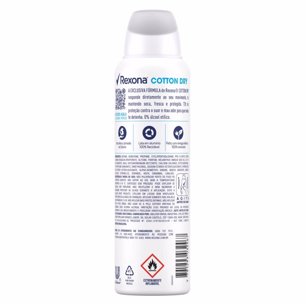 Mais uma vez Rexona se supera e relança sua linha de desodorantes com uma fórmula inovadora, o Desodorante Aerosol Feminino Rexona Cotton Dry combina um novo e exclusivo ativo antitranspirante com a tecnologia de fragrâncias encapsuladas. Esse desodorante antitranspirante aerosol a mantém protegida por até 72 horas, ativado pelo seu movimento e a deixa muito mais confiante para você encarar qualquer desafio. Com o registro de 16 patentes e mais de 300 testes técnicos, está comprovado que essa nova tecnologia antitranspirante entrega um nível de proteção contra o suor como nenhuma outra proposta regular já entregou antes. A nova e exclusiva fórmula de Rexona Cotton Dry trabalha com um sistema de partículas menores e mais estáveis que formam uma barreira protetora mais resistente e duradoura contra a transpiração e o mau odor, mantendo você seca, refrescada e protegida a cada novo movimento e por muito mais tempo. Sua fragrância contém uma rica combinação de notas verdes e florais, garantindo a sensação de frescor durante o dia inteiro.