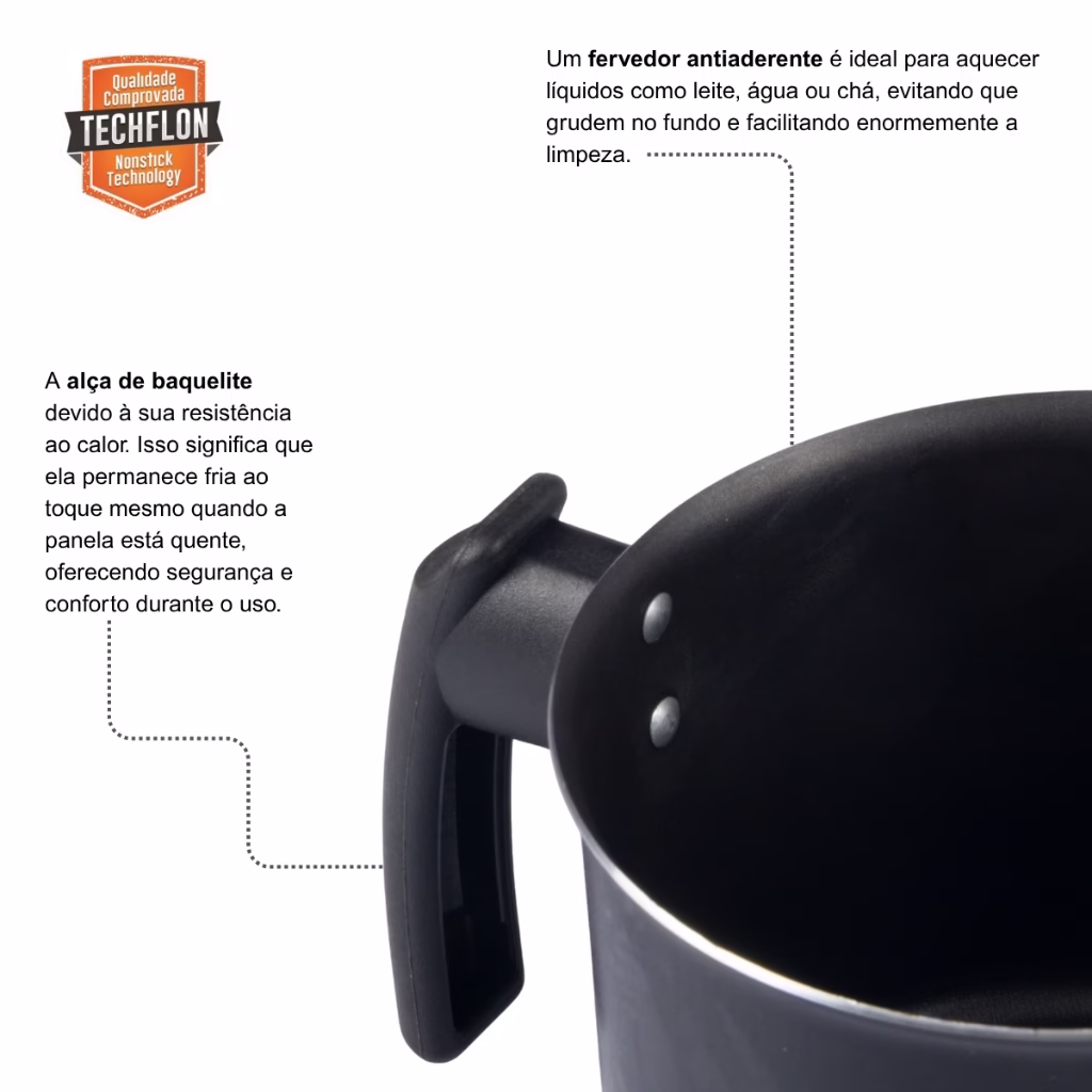 Fervedor de alumínio com diâmetro de 12cm. Possui o revestimento antiaderente interno que facilita na limpeza evitando problemas com resíduos aderidos ao caneco.
