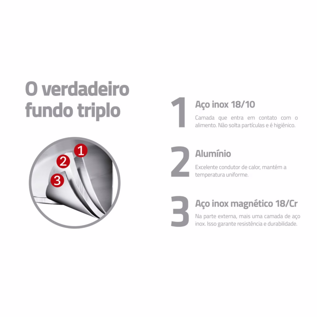 – O fundo triplo (aço inox + alumínio + aço inox) distribui o calor uniformemente, proporcionando um cozimento mais rápido e uniforme, economizando energia e deixando os alimentos aquecidos por mais tempo.