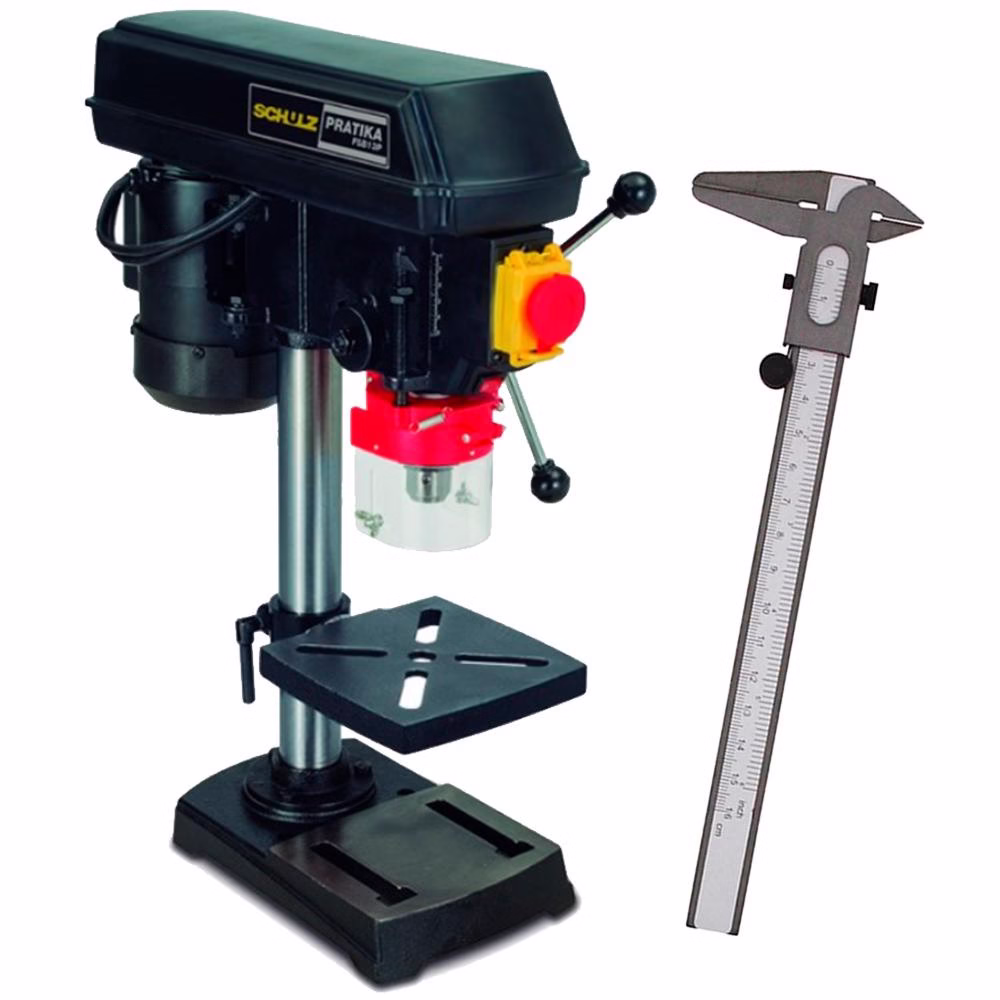 Furadeira de Bancada com Madril de 1/2″ FSB13P Pratika SCHULZ + Paquímetro de Aço 6 POL WESTERNCOMPOSIÇÃO DO COMBO:Furadeira de Bancada com Madril de 1/2 POL FSB13P SCHULZFuradeira de bancada com cabeçote, base e mesa em ferro fundido cinzentoAlavanca de avanço com 3 braçosMesa móvel e inclinávelFixação do motor com esticador permitindo rápida troca de correiaDesenvolvidas para uso doméstico, em operação de furação até a capacidade máxima indicadaInformações Técnicas:Capacidade de furação:Diâmetro máx.: 13mmProfundidade máx.: 50mmMotor elétrico:Potência do Motor: 1/3 cvPolos: 4Tensão: 220 VFrequência 60 HzRotação por minuto: 1725N° de velocidades: 05Garantia: 12 Meses (3 meses de garantia legal, e 9 meses de garantia do fabricante)Marca: SCHULZRef.SCHULZ-FSB13PImagem Meramente Ilustrativa+ Paquímetro de Aço 6 POL 150 MM WESTERNProduto ideal para medir espessura, comprimento, diâmetro e profundidade, com precisão.É fabricado em metal altamente resistente e possui escala em milímetros e polegadas.Tamanho: 150 mm x 1 mmCor: CinzaMaterial: AçoGraduação Milímetros e PolegadasCódigo de Fábrica: 1945Marca: WesternGarantia: 3 meses* Imagens meramente ilustrativas.