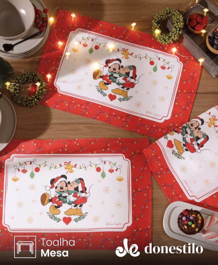 Jogo Americano Döhler Renova Mickey e Minnie 15D (4 peças, 45×31 cm). Em 50% algodão e 50% poliéster, leve, durável e fácil de limpar com Döhler Clean.