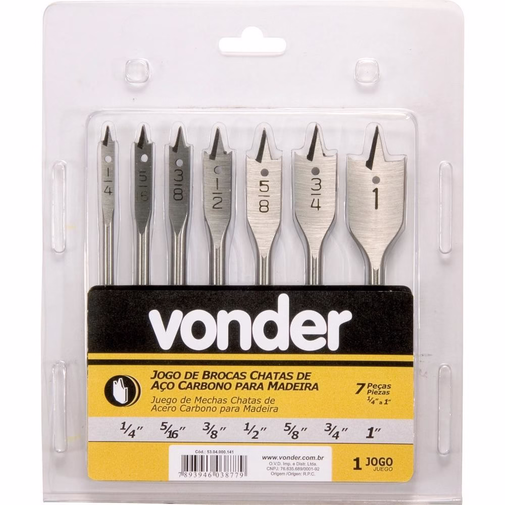 1 Jogo de brocas chatas com 7 peças, sendo: 1/4″ – 5/16″ – 3/8″ – 1/2″ – 5/8″ – 3/4″ e 1″