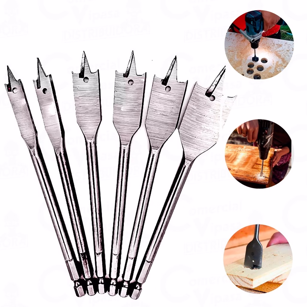O jogo de brocas chatas para madeira, composto por 6 peças, é um conjunto de ferramentas projetado especificamente para perfurar orifícios limpos e precisos em madeira.