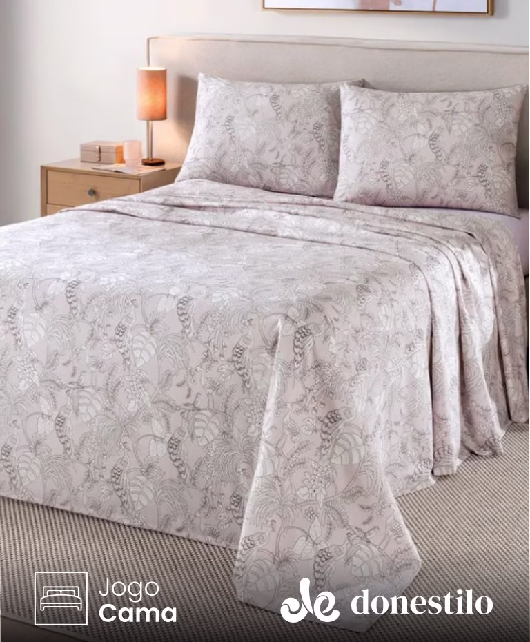 Jogo de Cama Casal 4 peças Döhler Pluma, 100% algodão, 130 fios. Estampa inspirada na natureza, macio e durável para noites tranquilas.