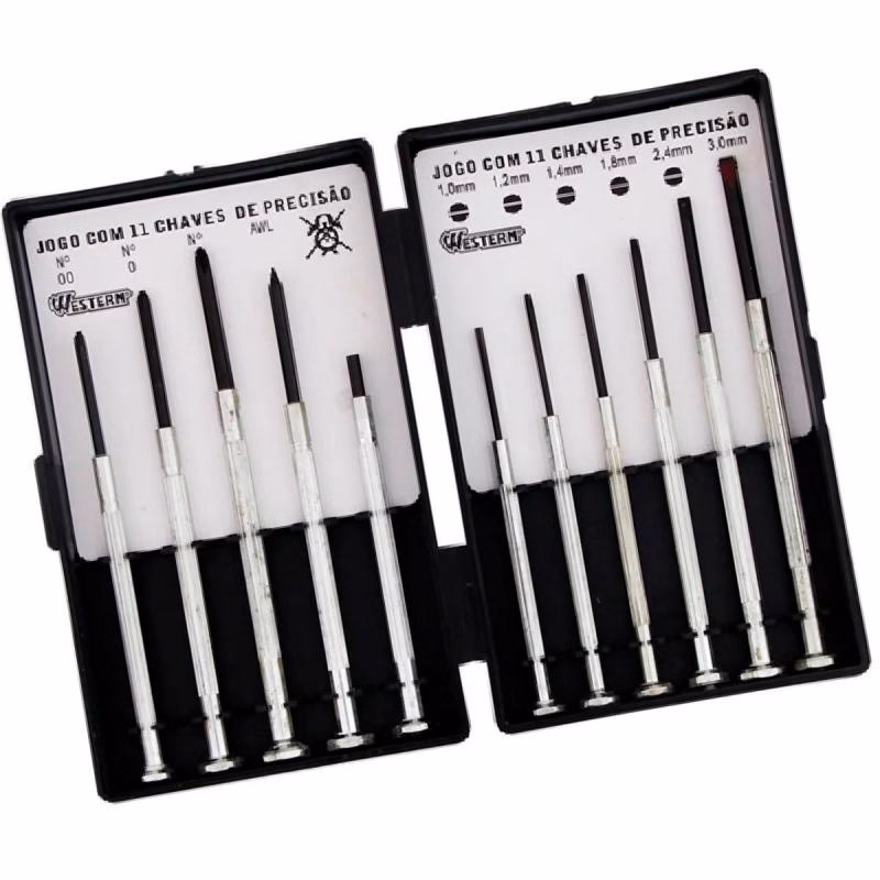 Jogo de Chaves Phillips e Fenda de Precisão Kit 11 Peças 111 WESTERNIdeal para manutenção de relógios, óculos e componentes eletrônicos, esse jogo conta com 11 chaves de precisão todas feitas em aço carbono e contam com um estojo em polipropileno.Possui 3 Chaves Phillips, 1 Chave pontuda, 1 Chave com ponta achatada e 6 Chaves de fenda.Especificações:Material: Aço carbono e PP.Cor: Preto.Marca: Western.Contém 11 chaves sendo:03 Chaves phillips : 00 – 0 – 101 Chave pontuda (AWL)01 Chave com ponta achatada06 Chaves fenda: 1,0 mm – 1,2 mm – 1,4 mm – 1,8 mm – 2,4 mm – 3,0 mmCódigo de Fábrica: 111Marca: WesternDimensões da Peça (aberta): 14 x 11,2 x 1 cmDimensões da Embalagem: 18 x 1,3 x 18,5 cmGarantia: 3 Meses* Imagens meramente ilustrativas.