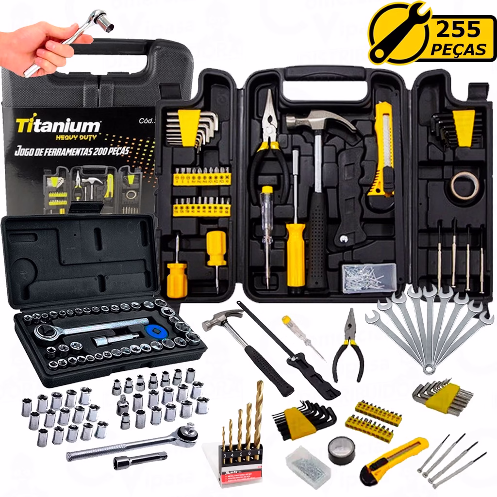 Kit Jogo Ferramentas Manuais + Chave Catraca + Brocas Completo + Maleta – 255 Peças Alta Qualidade