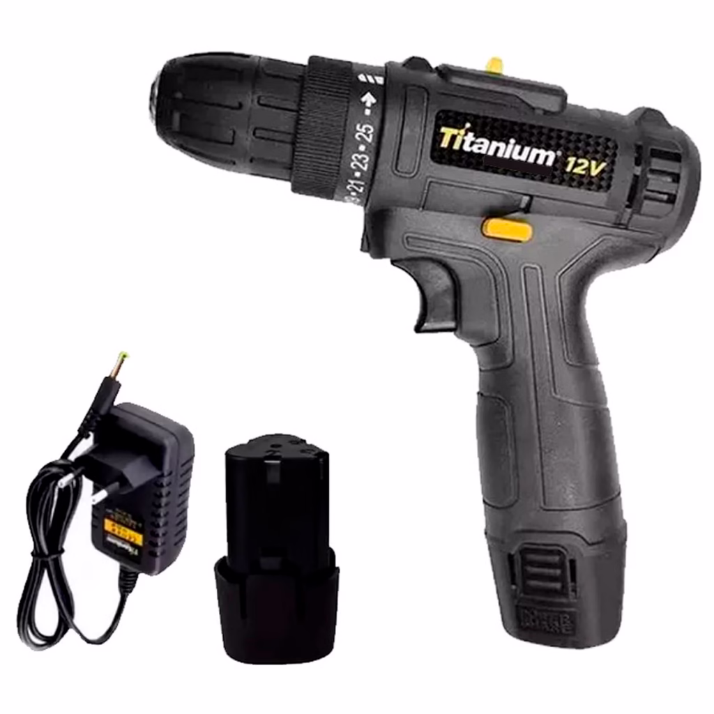 A Parafusadeira elétrica a bateria Titanium possui mandril de 3/8″ pol. (10mm) com aperto rápido e ajuste de torque/perfuração, regulagens com posição para perfuração e botão de sentido horário e anti-horário de rotação.