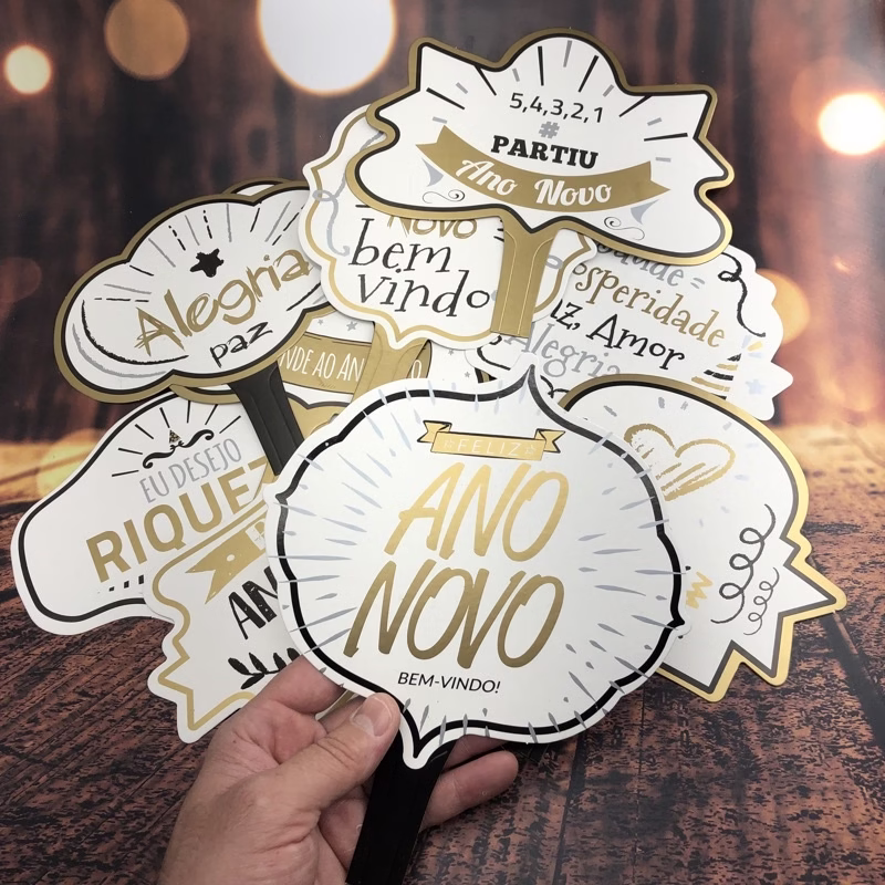 PRODUZIDAS EM PAPEL CARTONADO RESISTENTE COM IMPRESSÃO COLORIDA E VIBRANTE, COM DETALHES EM DOURADO OU PRATEADO PARA CELEBRAR A VIRADA. PALITOS DE PLÁSTICO RESISTENTE.