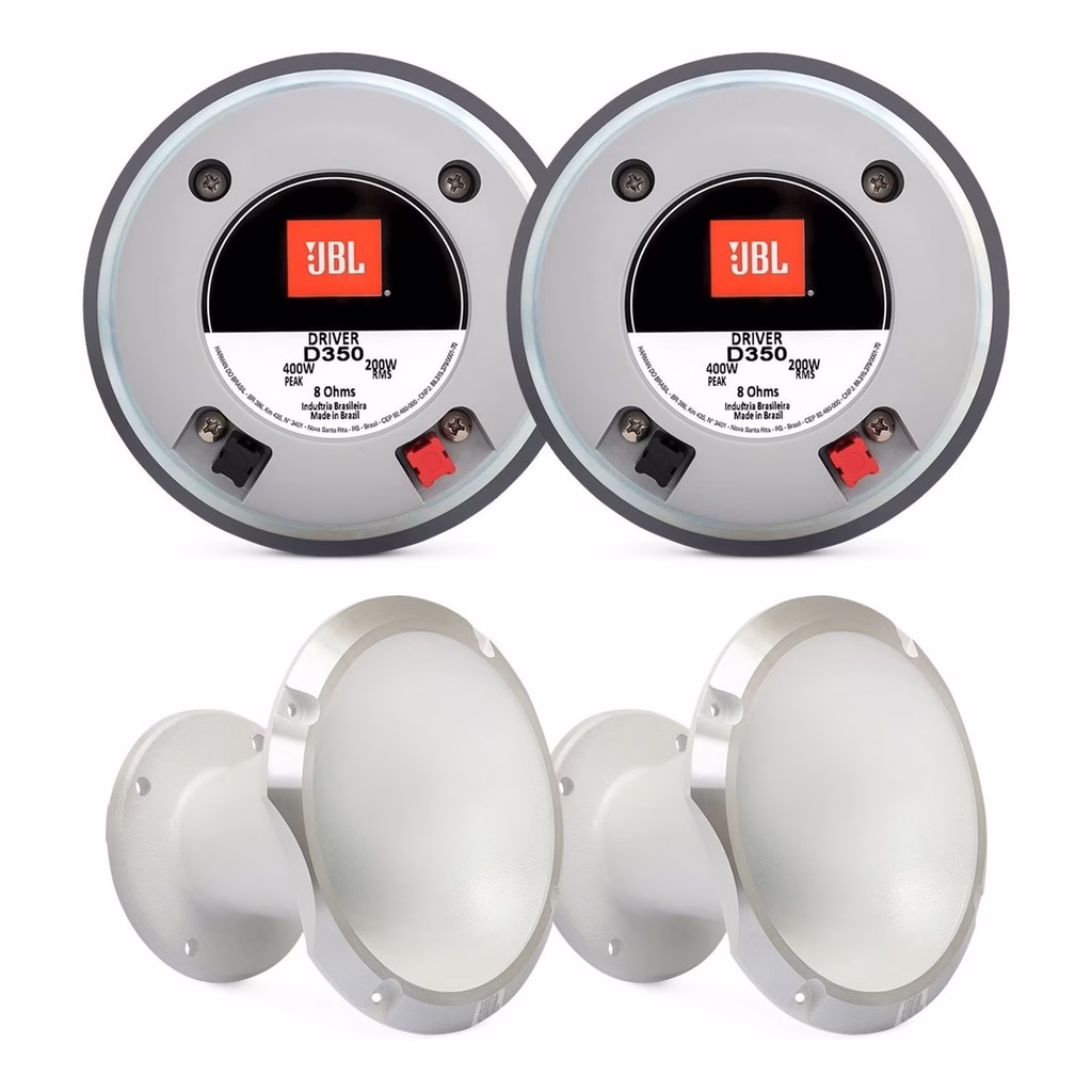 O novo Driver D350 é a solução ideal para sistemas de médio e grande porte. Projetado para responder com clareza e precisão nas médias e altas frequências, o D350 conta com incrível desempenho, suportando até 200W RMS.O Driver pode ser acoplado a uma corneta, sendo a combinação perfeita entre elegância, alta potência e qualidade. A corneta JBL HL 14-50 TRIO foi projetado para reproduzir alta pressão sonora com extrema clareza de som. Usado em conjunto com os drivers profissionais JBL, é capaz de reproduzir médios e agudos potentes e de qualidade impecável, com cobertura angular de 45º tanto no eixo vertical quanto no horizontal. Garanta já o seu kit!