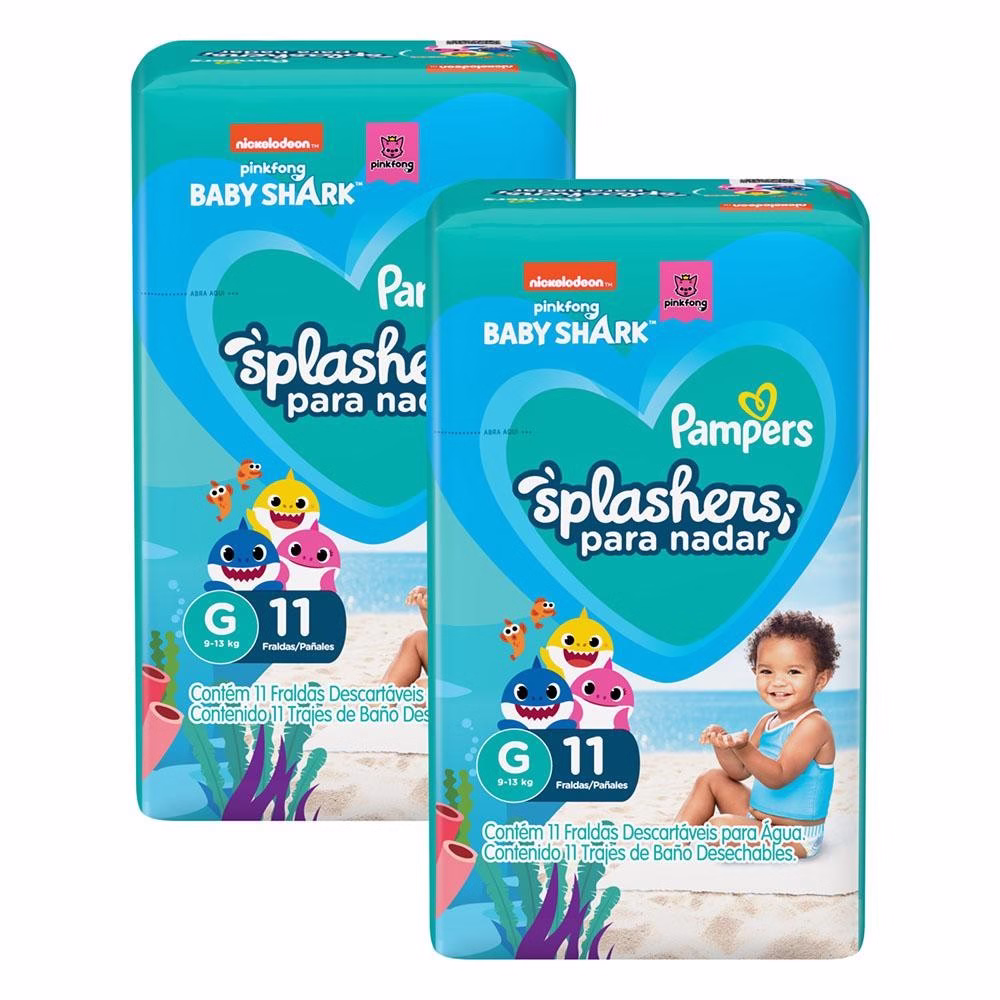Kit 2 Fraldas Pampers para Água Splashers Baby Shark G com 11un cada pacote.