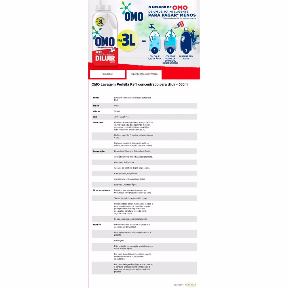 • OMO Lavagem Perfeita com garrafa refil econômica, com 500 ml de sabão líquido concentrado para diluir você faz 3 L