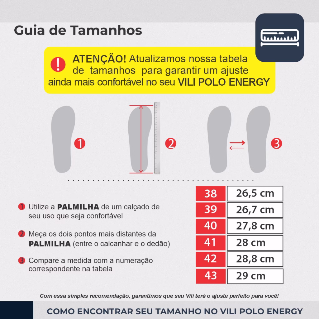💡 DICA: Meça a palmilha de um tênis confortável e compare com a nossa tabela!