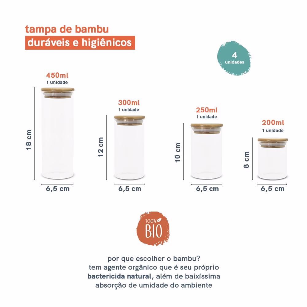 Conheça o kit de 4 potes de vidro herméticos circulares com tampa de bambu de 200ml, 250ml, 300ml,