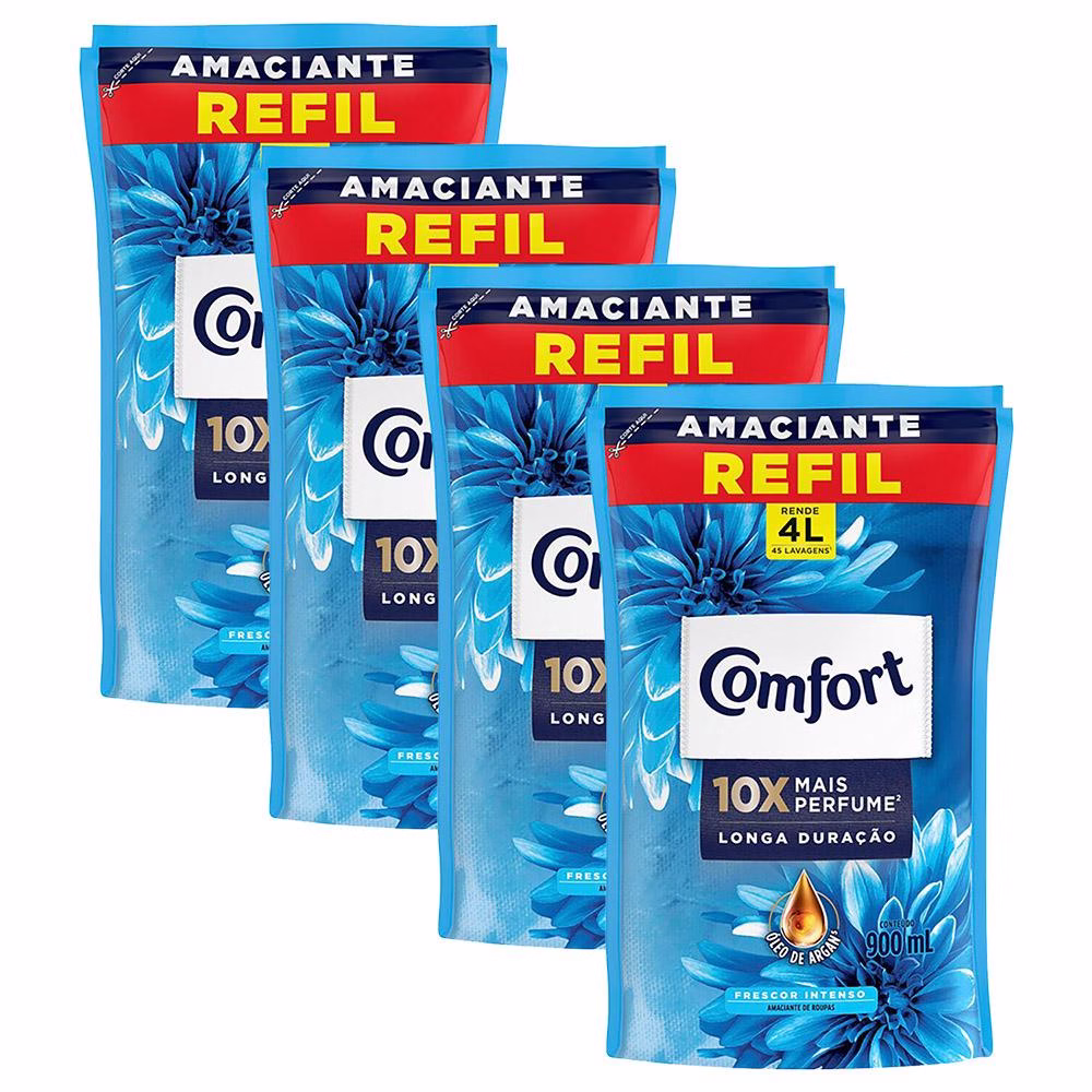 O Kit contém: 4 Refis Amaciantes Concentrados Comfort Frescor Intenso com 900ml cada.