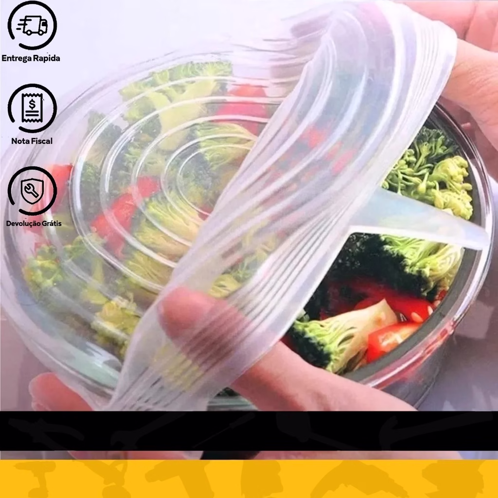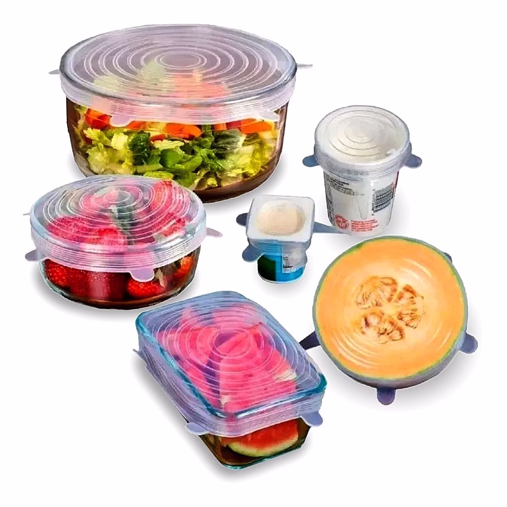 * O kit possui 6 tampas de tamanhos diferentes, produzidas em silicone altamente elástico, basta esticar a tampa ao redor da sua vasilha e pronto, você vai proteger o seu alimento, independentemente do tamanho do compartimento.
