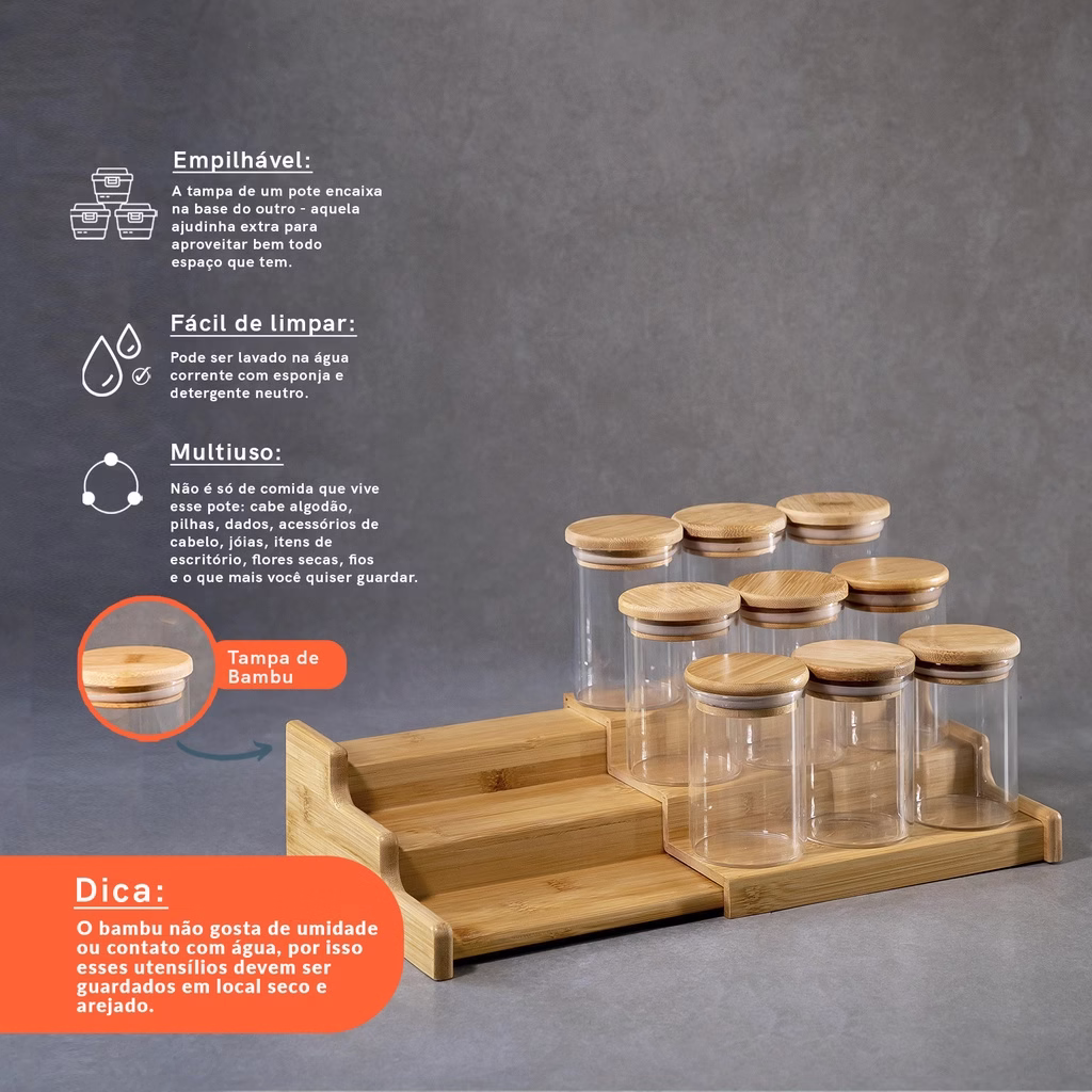 Esse é o kit 9 potes hermético 250ml com tampa de bambu e rack organizador de bambu – Oikos.