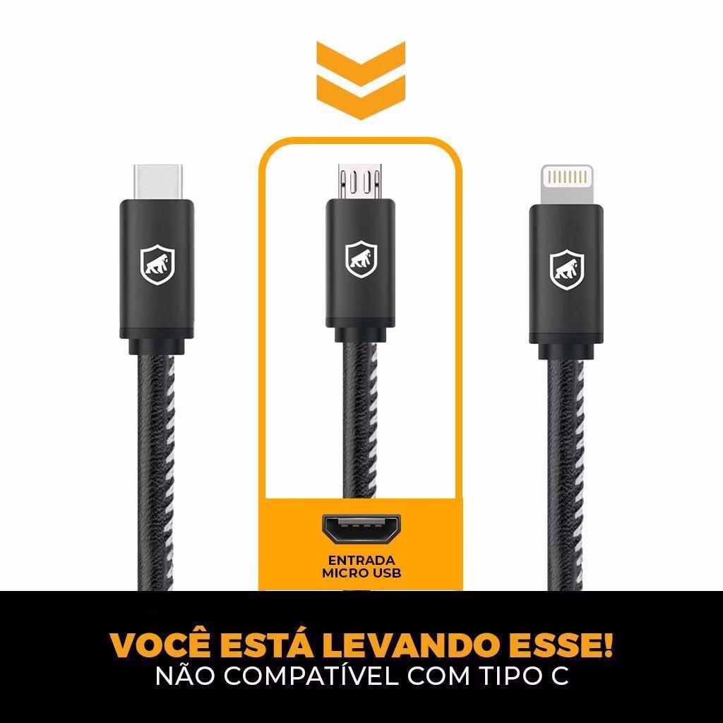 2) O Cabo Turbo Militar, da Gorila Shield, é o dispositivo mais moderno do mercado. Desenvolvido com cabos trançados de Cobre Ionizado, o equipamento garante um carregamento extremamente rápido para seu aparelho. Por ser fabricado em couro reforçado de alta resistência e possuir costura a laser de nylon trançado de 2mm, o cabo da Gorila é um dos mais resistentes do mundo.