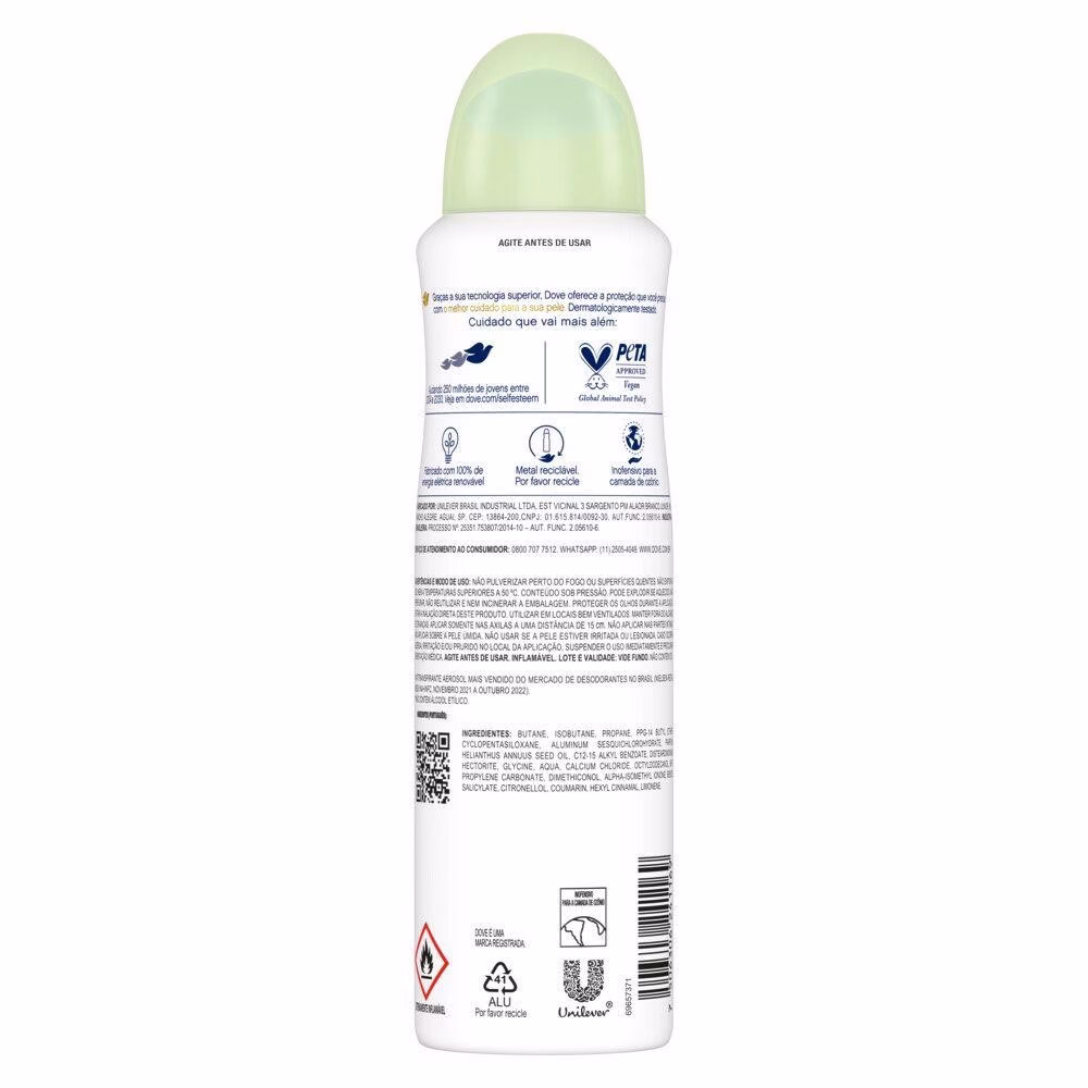 • Pomba Pepino e Chá Verde é um desodorante antitranspirante sem álcool e testado dermatologicamente • Dove não realiza testes em animais, sendo certificada como Cruelty-Free pela PETA, o aerosol não danifica a camada de ozônio e nossas latas são feitas de metal reciclável.